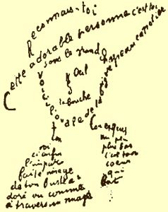 Para muchos los primeros caligramas se le deben al poeta Guillaume Apollinaire, dato que también lo considero así, por su reconocida obra de caligramas «Poemas de la paz y de la guerra» donde se apolla de otras técnicas como la escritura automática.